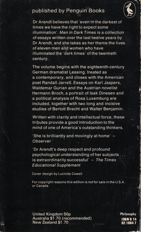 "Men in Dark Times" originally appeared in 1968, but this Pelican Books edition from 1973 made the work accessible to a much broader audience. Pelican Books, founded by Allen Lane in 1937, had as its mission to make high-quality non-fiction available to ordinary readers.